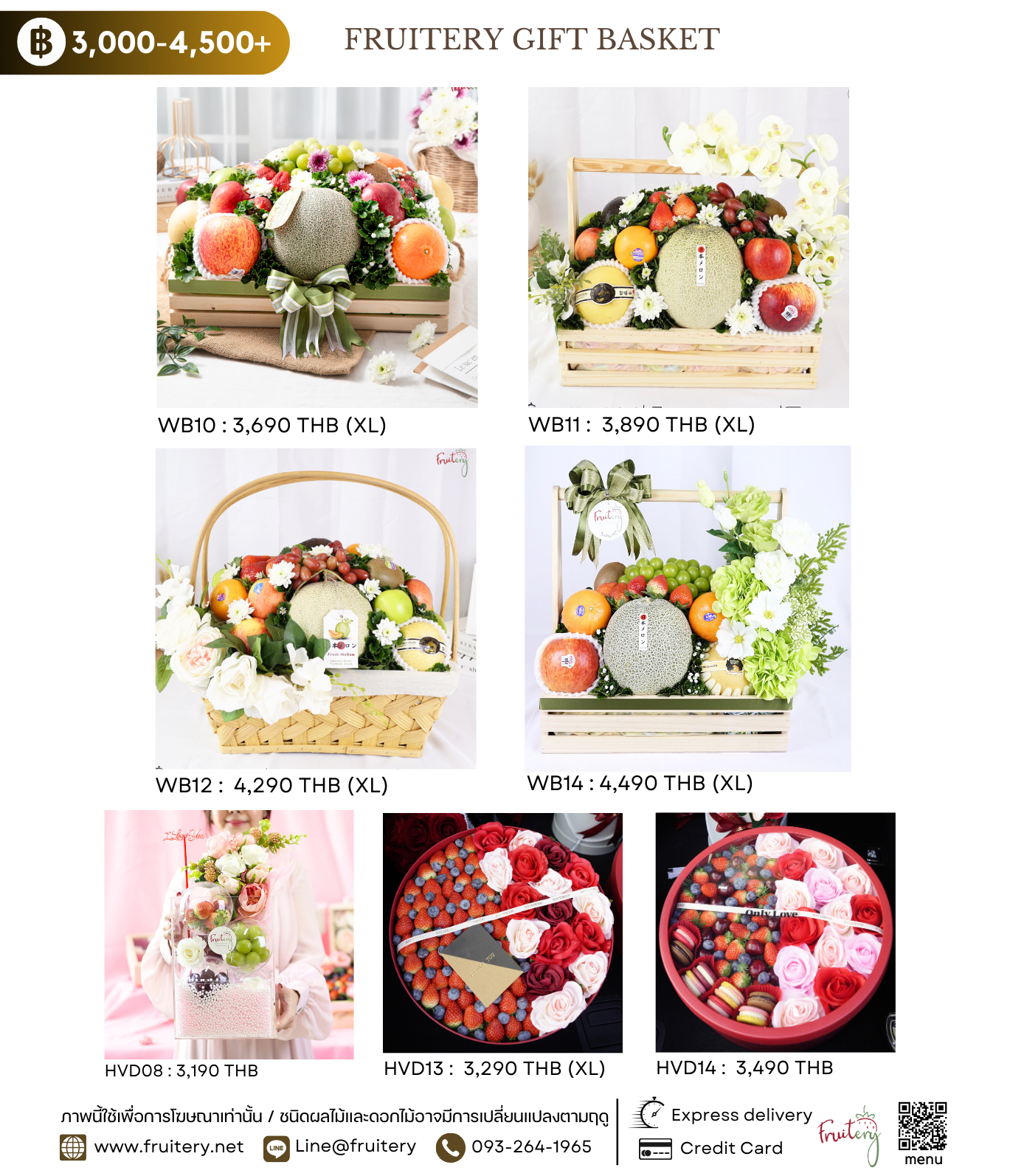 Fruit & Flower Gift Box (Size L) Floral & Botanical Theme กล่องของขวัญผลไม้นอกรวม ตกแต่งด้วยดอกไม้สด (กล่องสีแดง/เงิน/ทอง)