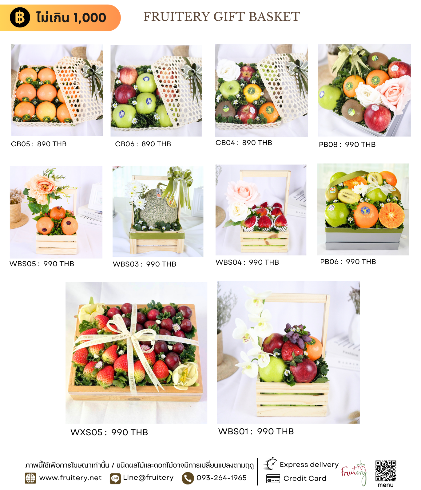 กระเช้ารวมผลไม้นอก 7 ชนิด ตกแต่งด้วยดอกไม้สด Size M)